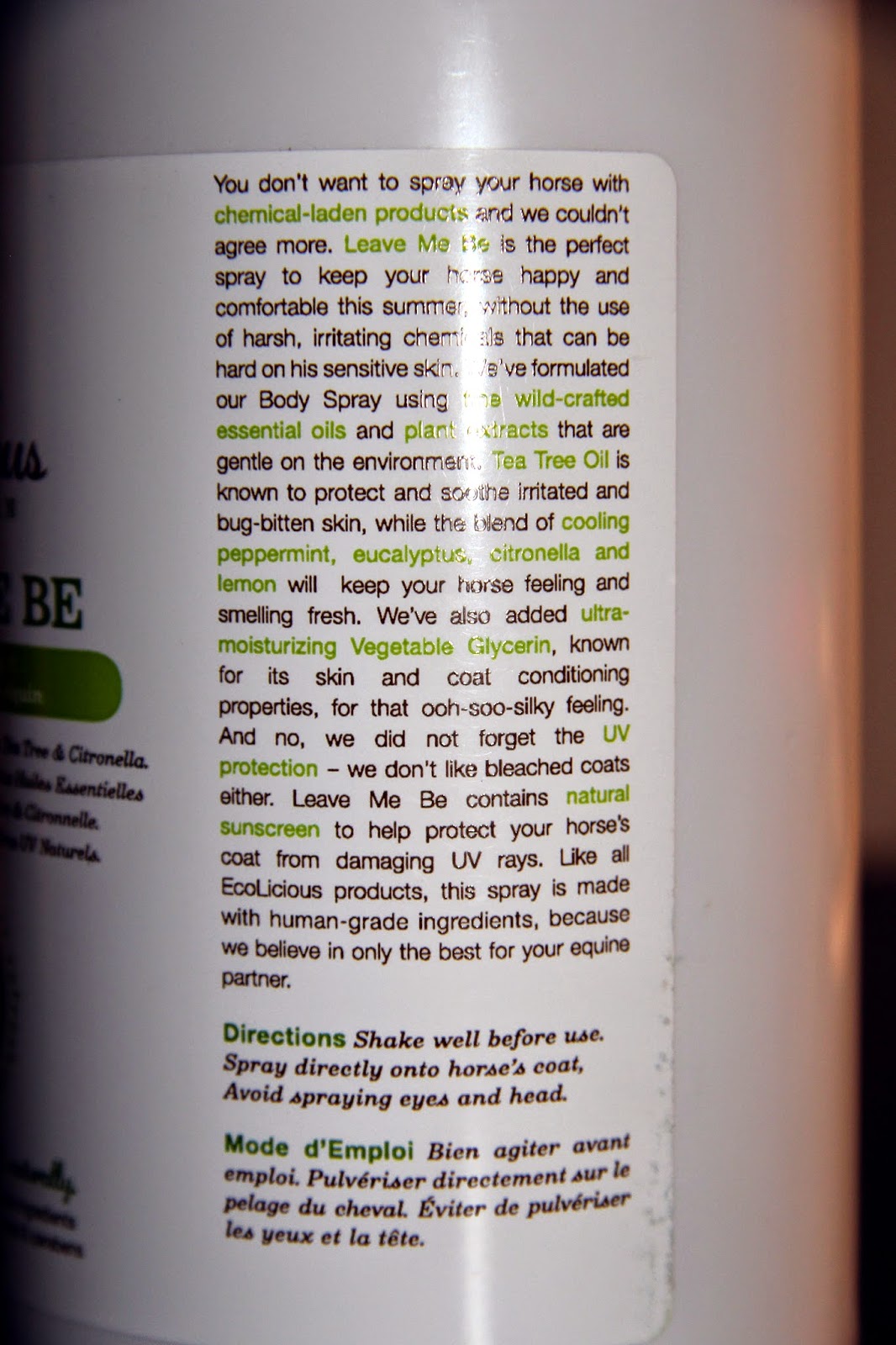 Now, the Leave Me Be Equine Body Spray. The first and most important thing I will tell about this fly spray is that it is all natural, it doesn’t have a single chemical in its formula – so now you tell me, what could be better than this?! I don’t want to use those crazy fly sprays on my girl!
