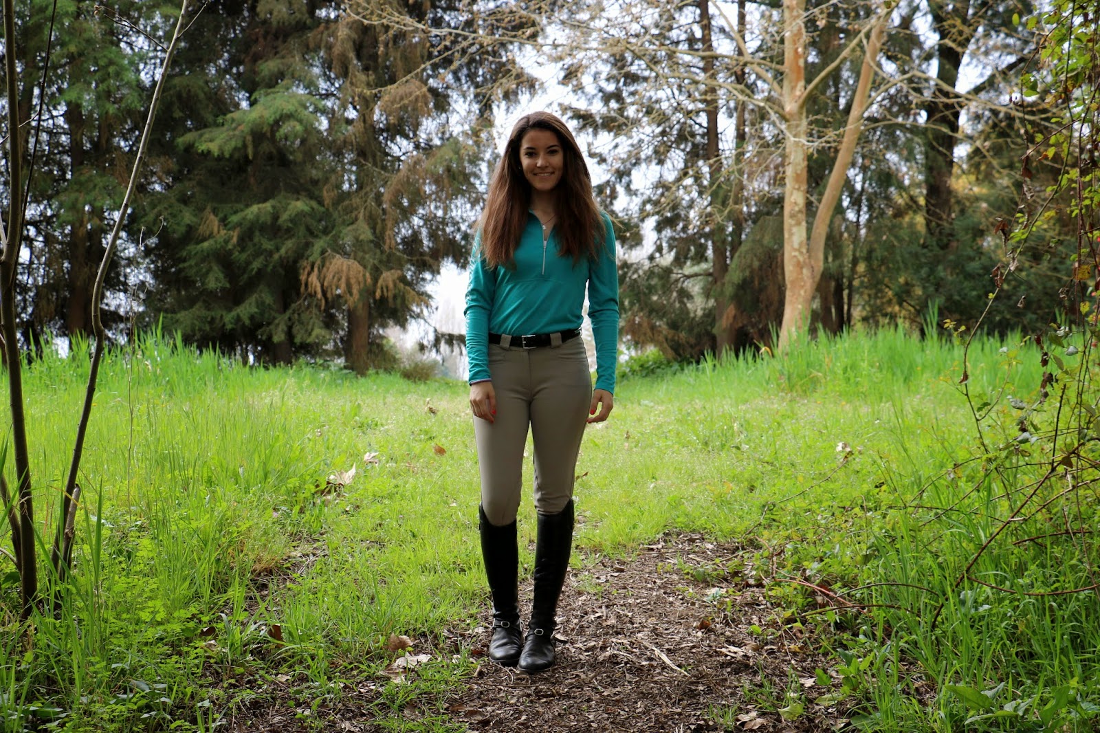 So excited to be breaking out my spring wardrobe! I am crazy about the teal color of my new – well, I got it a few time ago but it was too cold to wear it – Fancy Sport Shirt by Equestrianista. To be honest, I love any kind of teal or mint, look at Equestrian Trend’s logo! My favorite part of this season is being able to pair light colors – beige breeches – with a stronger and vibrant color – the shirt – and use navy or a darker color as an accent color – the vest.