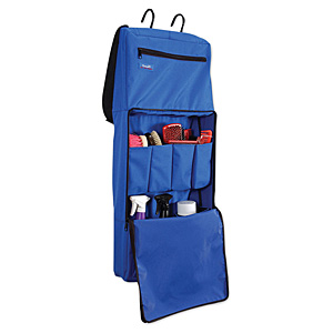 Heavy denier nylon Portable Grooming Organizer with 2 hook tack rack. Adjustable shoulder strap with clip. 14″ pocket with zipper closure. Four 6″ pockets, three 8″ pockets and two bottom pockets (9″ and 2″). 16″x 34″.
